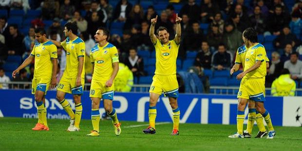 AFPGelandang APOEL Nicosia, Gustavo Manduca (tengah), merayakan golnya ke gawang Real Madrid, pada leg kedua perempat final Liga Champions, di Santiago Bernabeu, Rabu (4/4/2012).